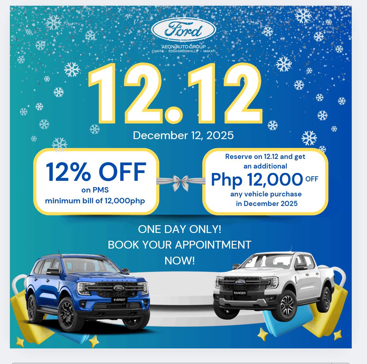 Service: Enjoy 12% OFF on your PMS! Sales: Reserve a New vehicle on December 12, 2025 and get an extra ₱12,000 discount! Vehicle must be released by Dec 31, 2025.Don’t miss these limited-time offers! Drive home with more savings this season.